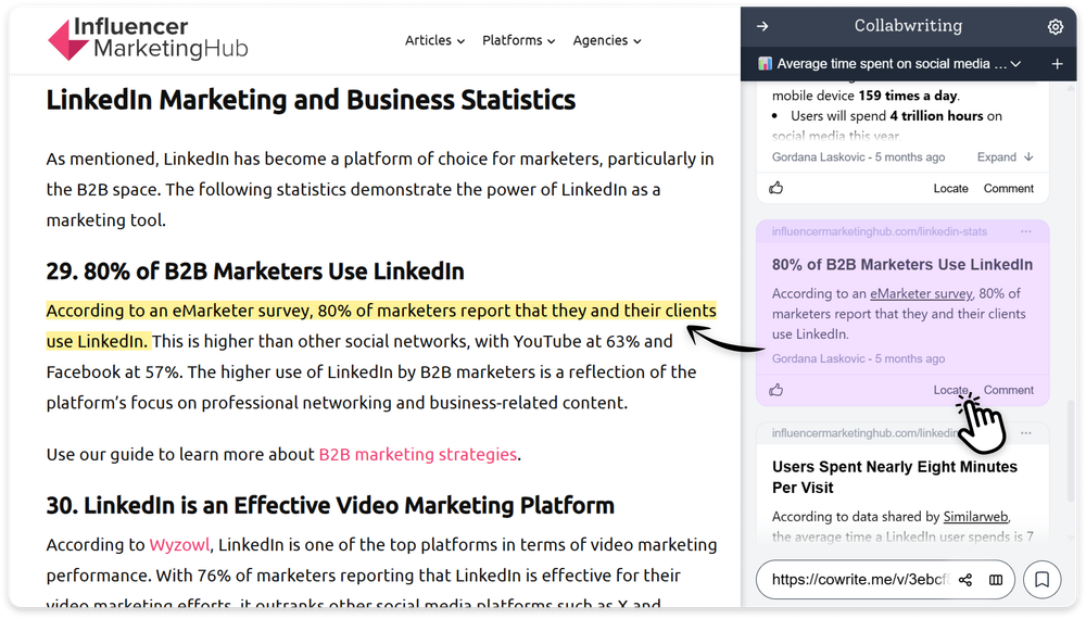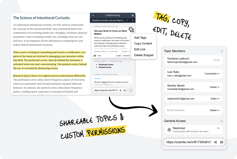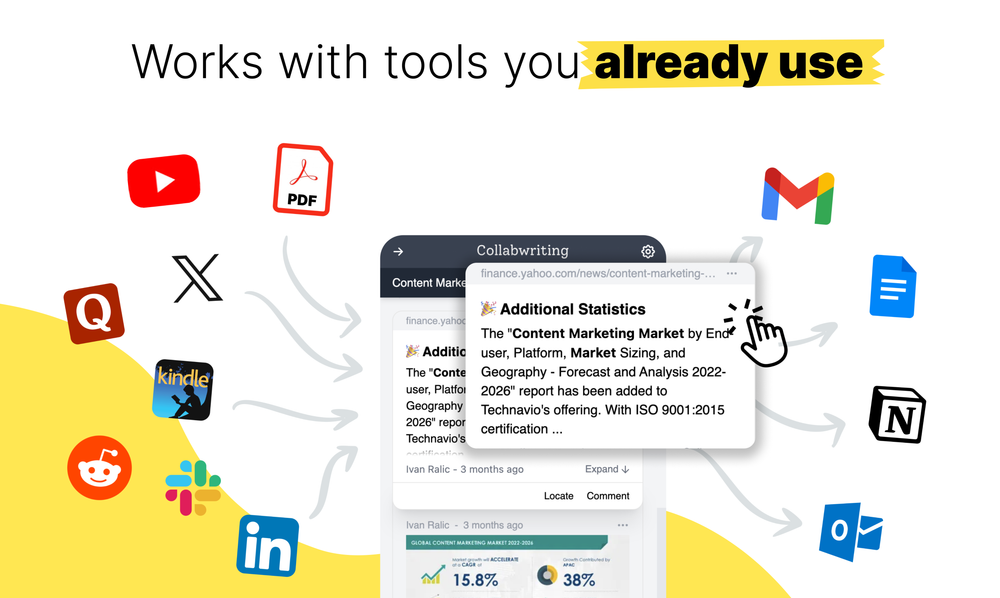 Collabwriting is ideal for teams. It lets you save, highlight, comment, and tag insights from web pages, PDFs, and videos while keeping full context.
