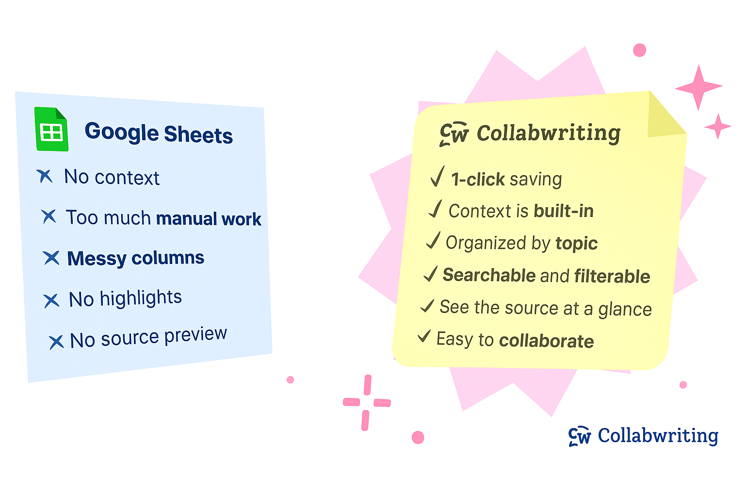 Collabwriting combines the strengths of Notion, spreadsheets, and bookmarking tools. It allows real-time capture, organization, and collaboration, keeping source context intact.