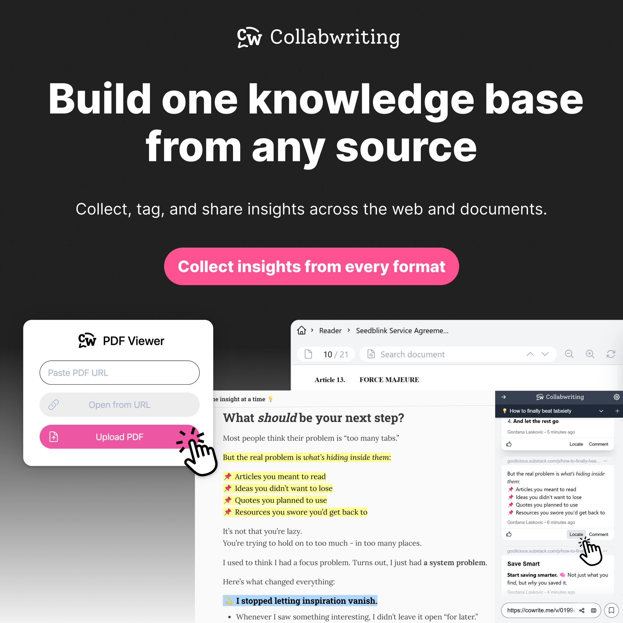 Collabwriting is ideal for teams. It lets you save, highlight, comment, and tag insights from web pages, PDFs, and videos while keeping full context.