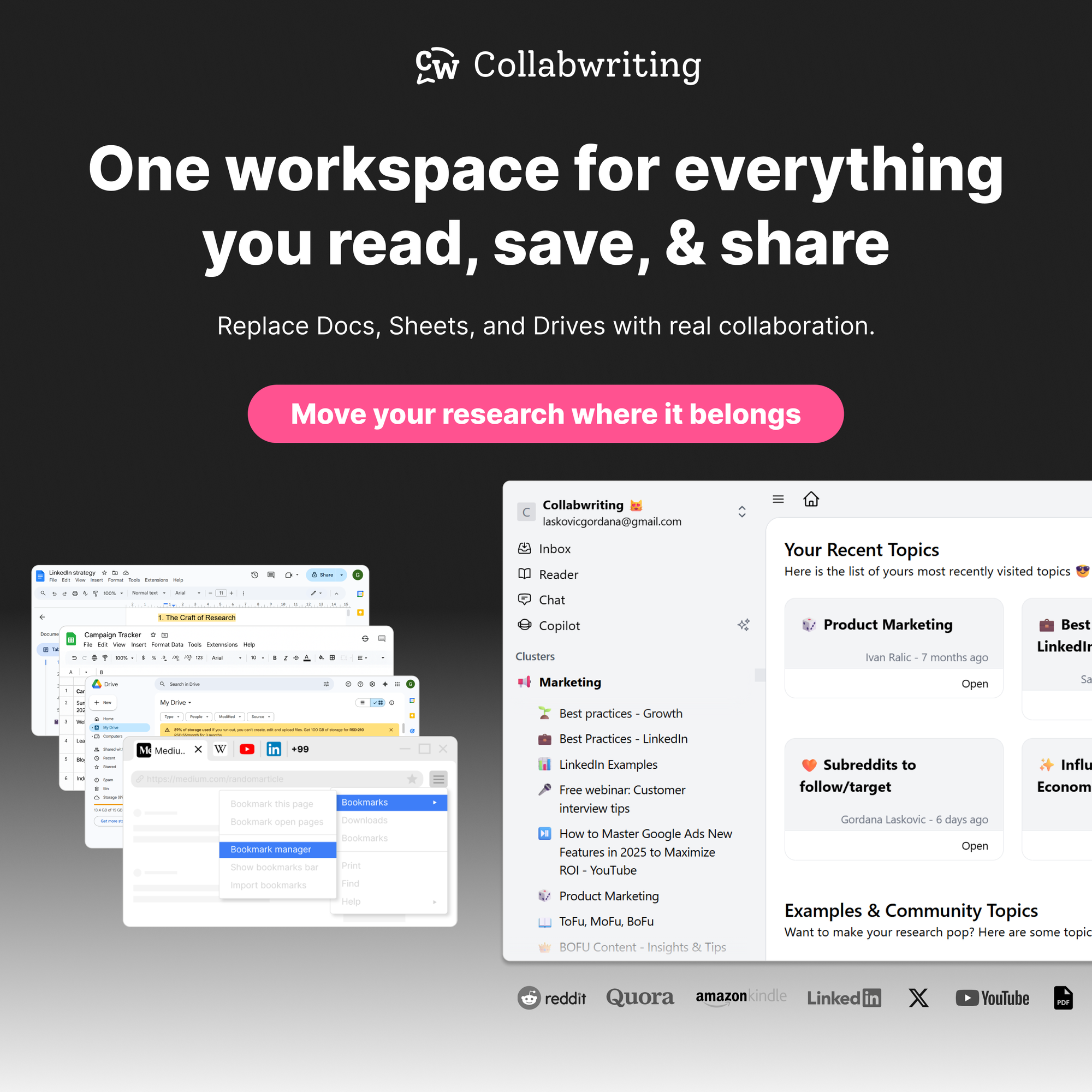 Collabwriting ensures highlights, notes, tags, and clusters stay connected to the original source. Chat agents speed up discovery, while collaboration ensures nothing slips through the cracks.