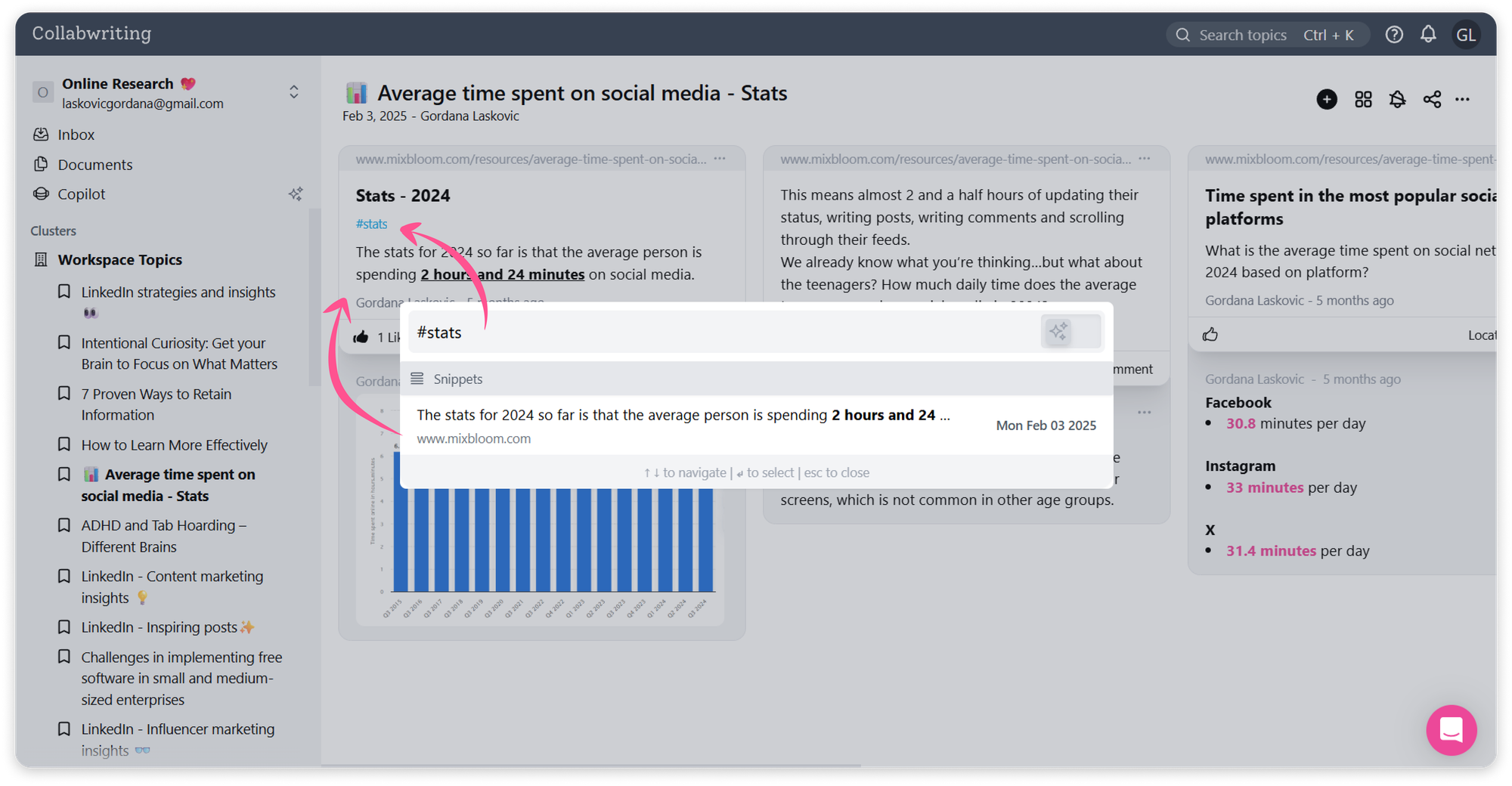 The AI instantly pulls relevant insights from both the web and your Collabwriting workspace. Each answer comes with source links, which I review, save in clusters, and share with colleagues for verification.